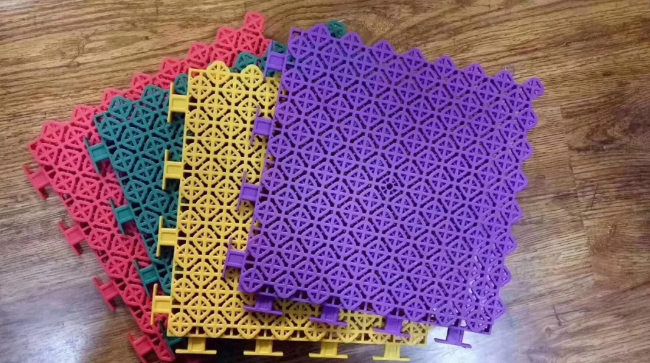A、外觀:表面無龜裂、起泡、塑化不良、地板正面無毛刺、地板背面觸腳粗細一致,筋位勻稱。材料(PP)填充均勻,表面無小洞