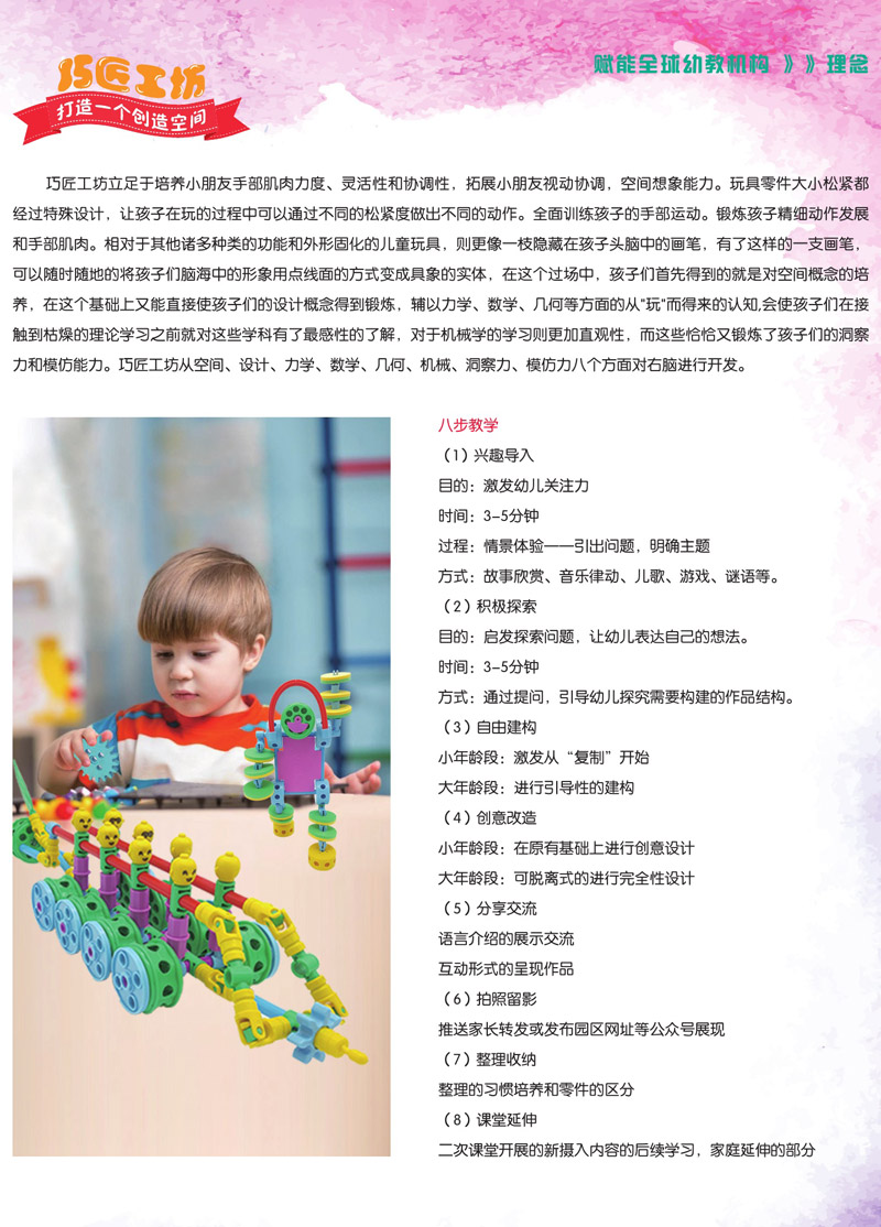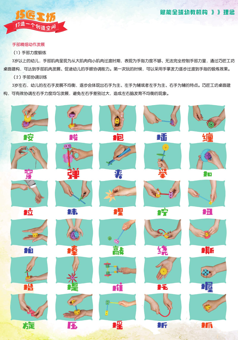 桌面益智玩具 戶外玩教具 運(yùn)動(dòng)課程 夢(mèng)幻組件 特色構(gòu)建室 巧匠工坊視頻展示 巧匠工坊說明書