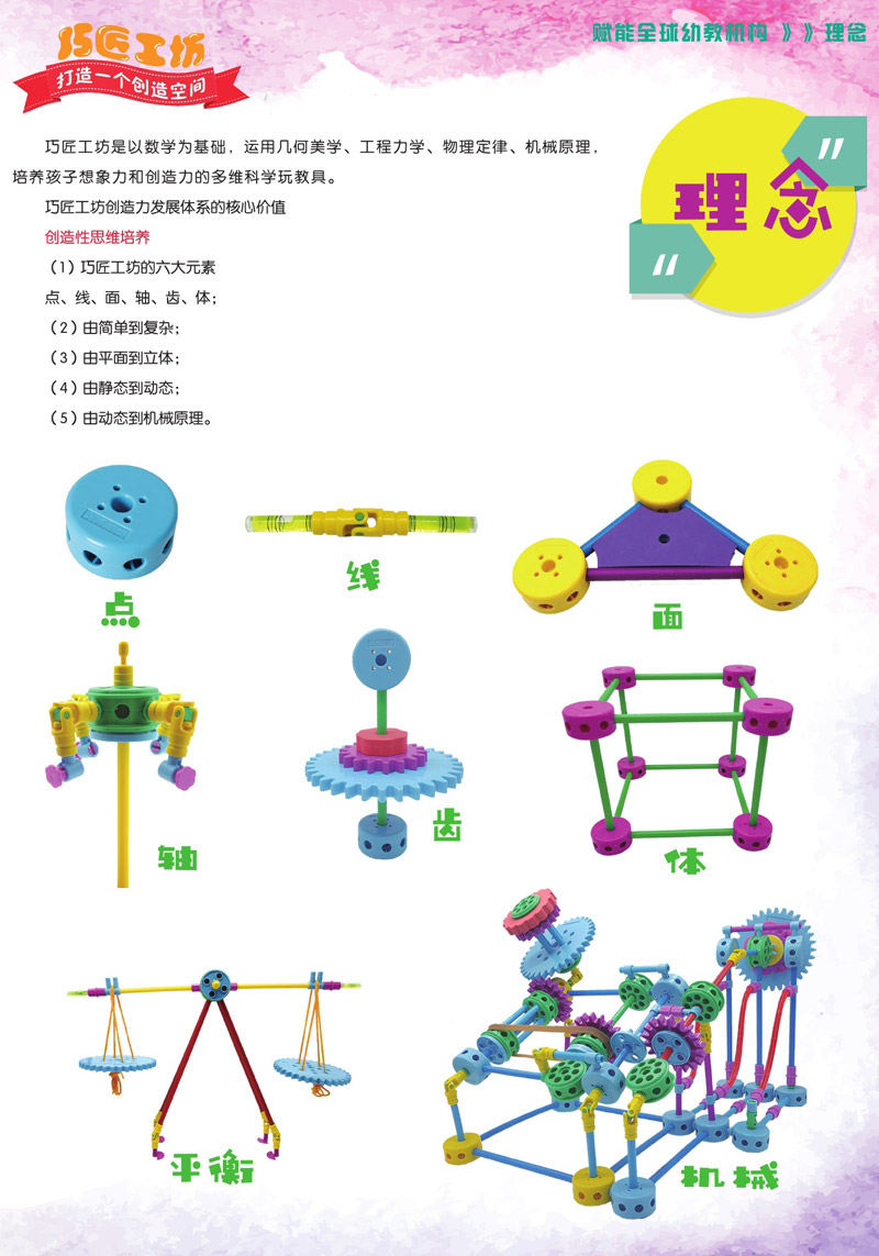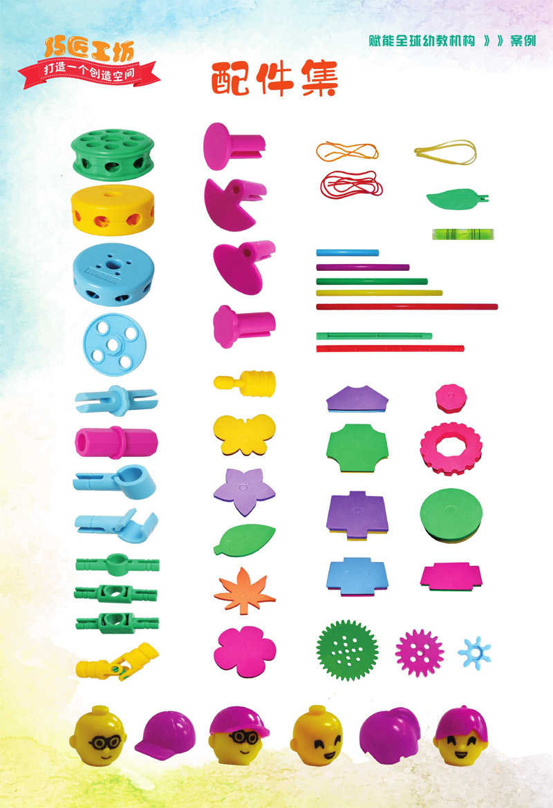 巧匠工坊組件:桌面益智玩具套裝的可變性決定了其創(chuàng)造性特點(diǎn),是幼兒創(chuàng)造性思維能力發(fā)展的可依托的好材料。